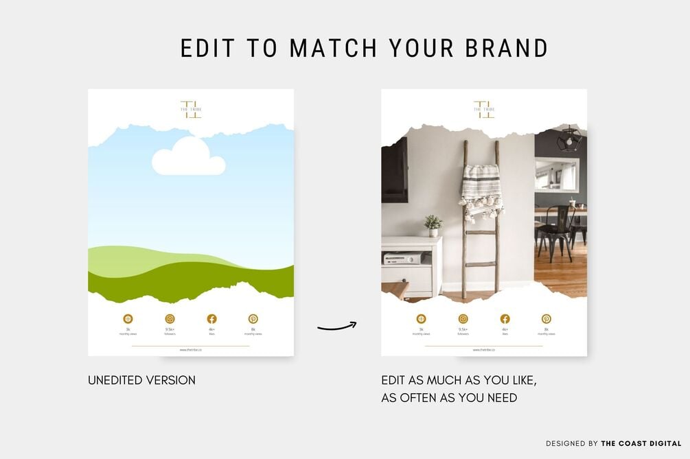 With a minimalist look and clean design, this is an eye-catching guide that will capture the attention of any brands you want to pitch. Easily editable in Canva, you can make it your own with only a few clicks, using Canva's drag and drop functionalities and friendly interface. The website is free for you to use and allows for unlimited edits and downloads!